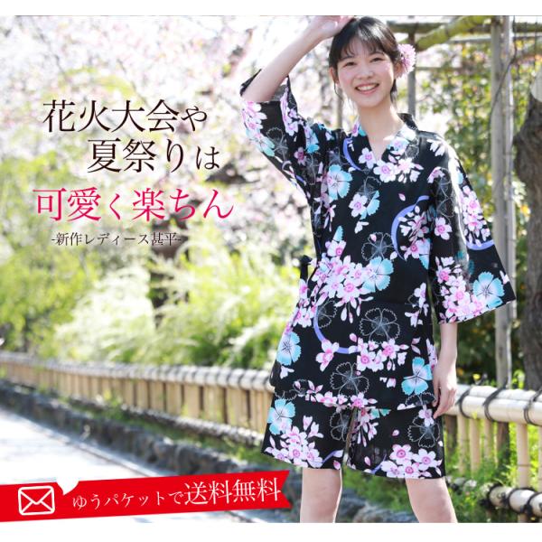 女性用 甚平 レディース かわいい和柄 じんべい 黒 和の洋服とエプロンのお店 布和里のページ ひもづけ Com